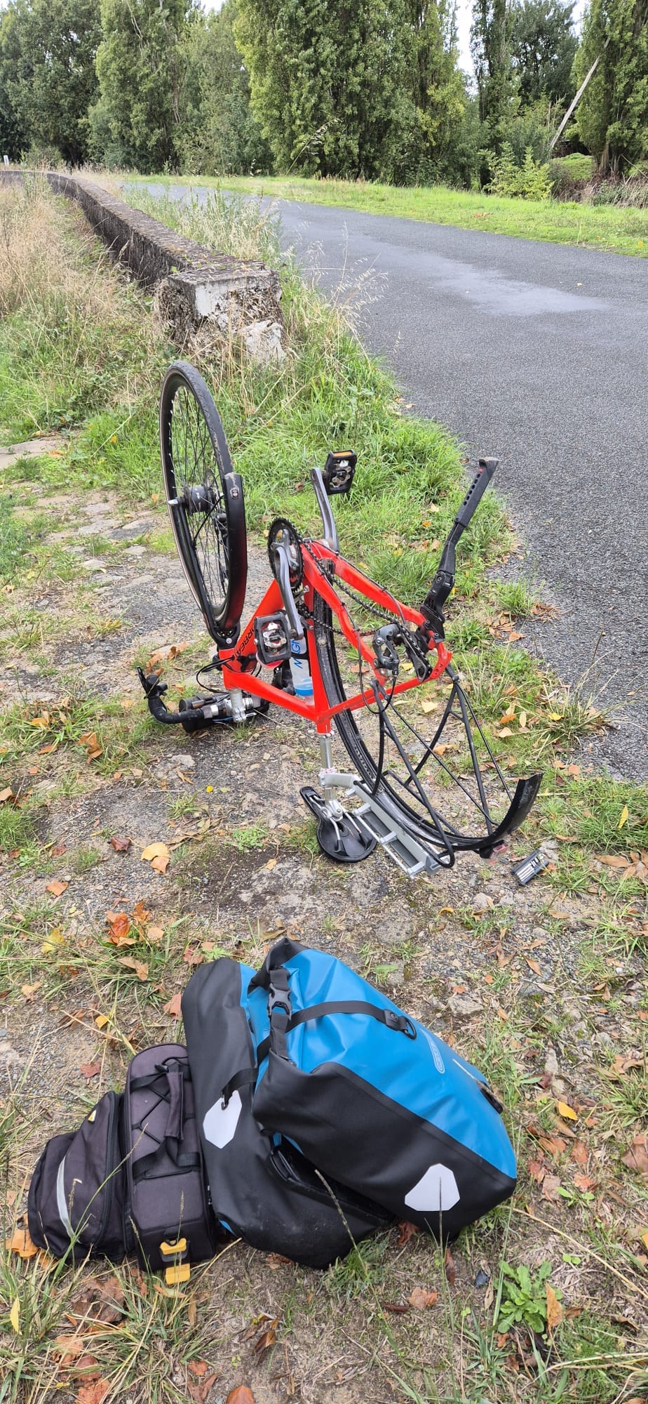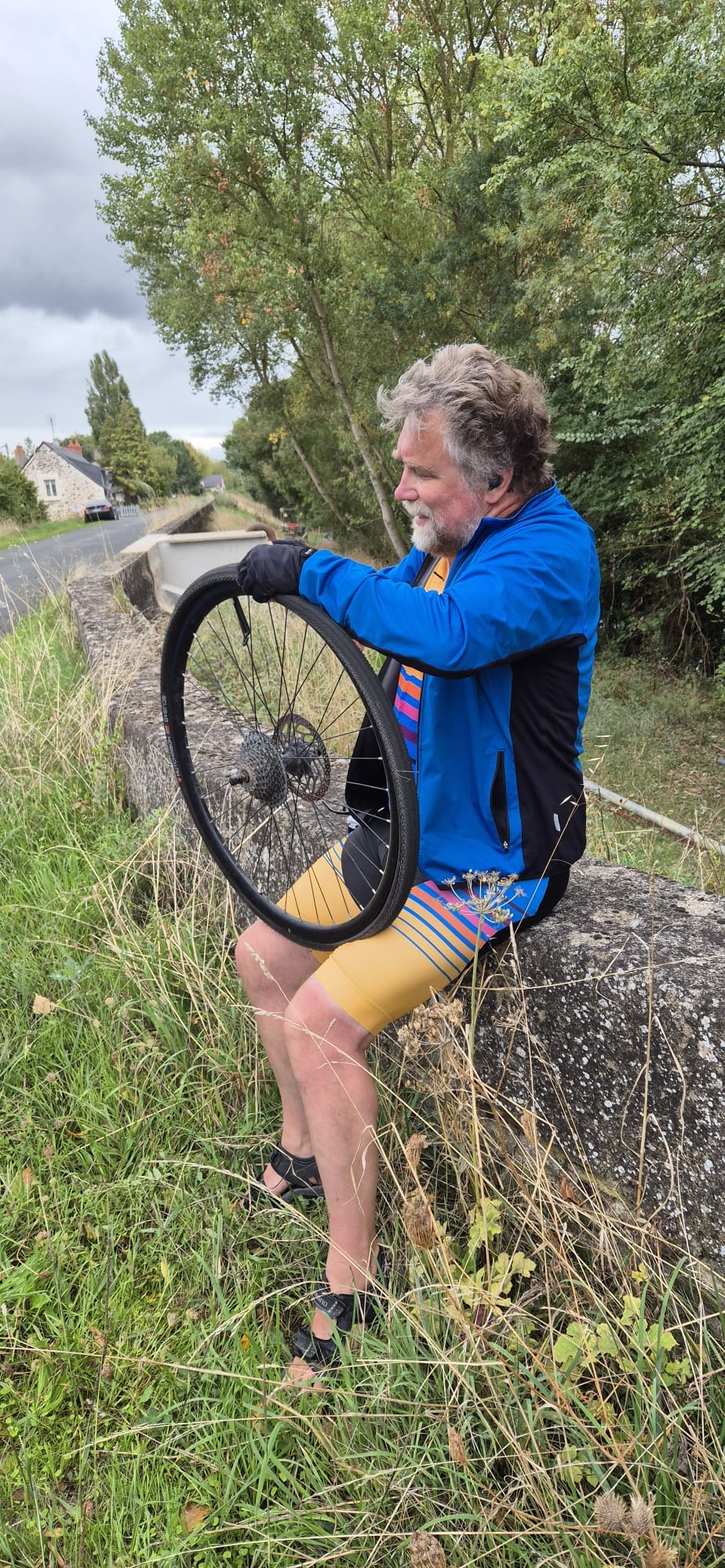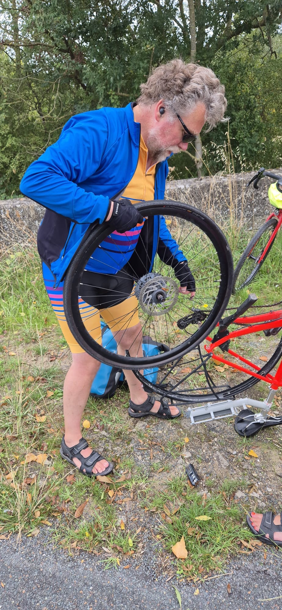 Ich war sehr frustriert als mein Reifen erneut den Geist aufgab. Wir waren so gut in der Zeit und strampelten, was die Beine hergaben und dann sowas... noch nie habe ich Charlie in einer solchen Akkordzeit einen Schlauch (Hinterrad) wechseln sehen. Hut ab! Kerstin und ich haben assistiert und tatsächlich waren wir nach weniger als 10 Minuten wieder on the road. Glücklich am Bahnhof angekommen, dann das Malheur mit der Treppe. Fix und fertig sind wir in letzter Sekunde in den Zug gehüpft. Was für ein letztes Abenteur auf Rädern für diese Tour.